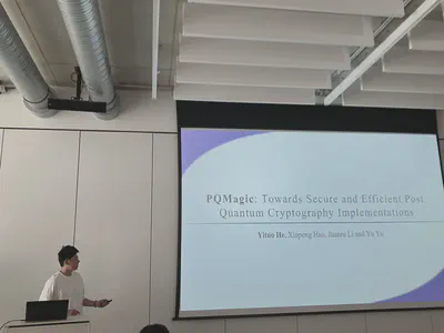 到了下午,我也上台分享了我们的工作PQMagic:Towards Secure and Efficient Post Quantum Cryptography Implementations。首先分析了当前主流的SOTA开源库中存在一系列不安全的模式,并且其效率也有很大的提升空间;然后分享了我们的改进思路;随后展示了与SOTA库的比较结果,PQMagic有着更安全的实现模式,并且效率提高接近2倍;最后与传统密码的比较中验证了PQMagic的实现性能甚至优于OpenSSL中高度优化的传统密码算法,验证了PQMagic在对后量子密码迁移工作有促进作用。没想到现场人数还比较可观,并有三位参会者提出了些许疑问,并指出希望我们的网站后续能提供一下英文的版本。